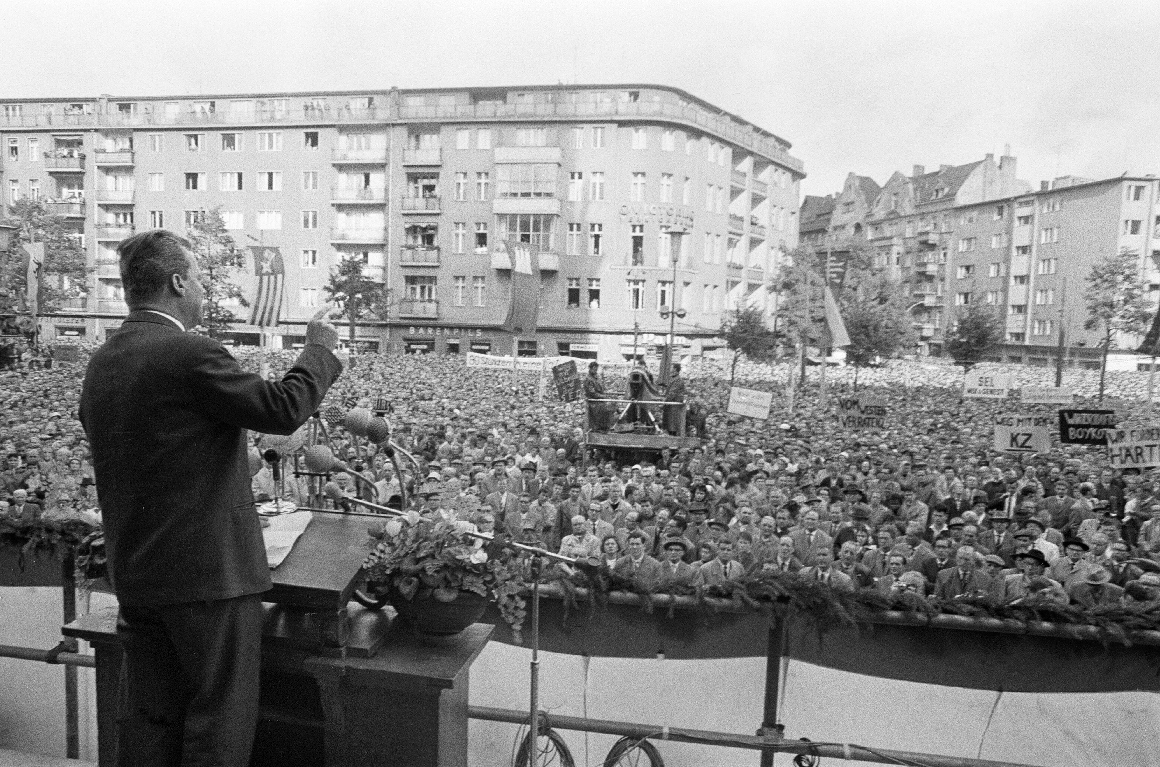 Foto: Menschen bei der Kundgebung vor dem Schöneberger Rathaus, 16.8.1961 © Alamy Stock Foto/Mirrorpix