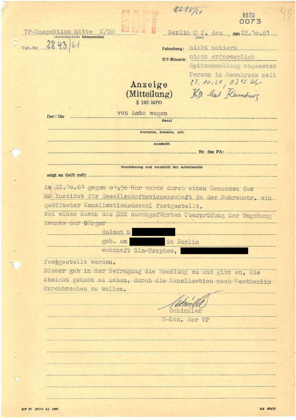 In der Nacht zum 13. August 1961 ließ die DDR-Regierung die Grenze rund um West-Berlin abriegeln. Volkspolizei und Betriebskampfgruppen marschierten an der Sektorengrenze auf und errichteten Stacheldrahtsperren. Die Nationale Volksarmee der DDR und auch sowjetische Truppen waren in Alarmbereitschaft. Die Regierungen in Ost-Berlin und Moskau wollten sowohl für einen Konflikt mit den Westmächten als auch für einen Aufstand gewappnet sein. An diesem Sonntagmorgen erwachten die Menschen in Ost- und West-Berlin in einer mit Stacheldraht geteilten Stadt. Viele machten sich vor Ort ein Bild von der Lage. Noch war die Hoffnung groß, dass es nur eine kurzzeitige Abriegelung der Grenze ist. -