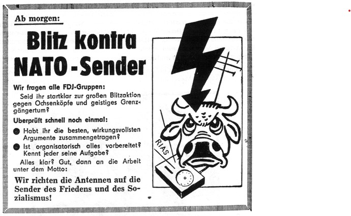 Der RIAS (Rundfunk im amerikanischen Sektor) war eine Rundfunkanstalt in West-Berlin. Er wurde von der US-amerikanischen Militärregierung initiiert und sendete zunächst Radiobeiträge, später wurde er durch ein Fernsehprogramm ergänzt. Da auch Ost-Berliner die Sender empfangen konnten, wurden sie bald zu einer wichtigen, aber von der SED-Führung verurteilten Informationsquelle. Die Menschen in Ost-Berlin und in Teilen der DDR konnten so Informationen und Nachrichten erhalten, die in der DDR zensiert oder verzerrt dargestellt wurden. Die SED-Regierung erklärte den RIAS in den 1950er Jahren zu einer "Spionage-, Sabotage- und Verbrecherorganisation".