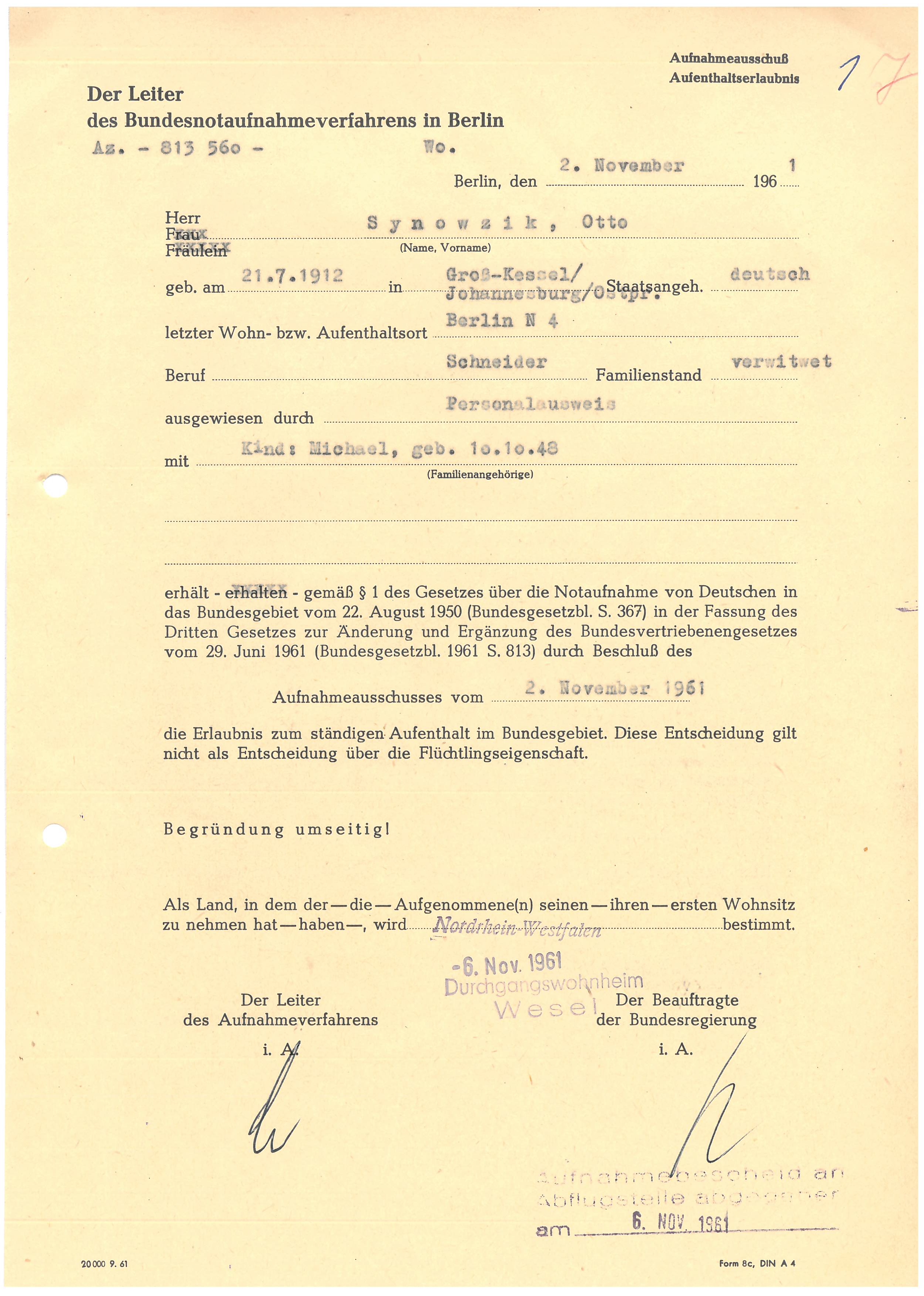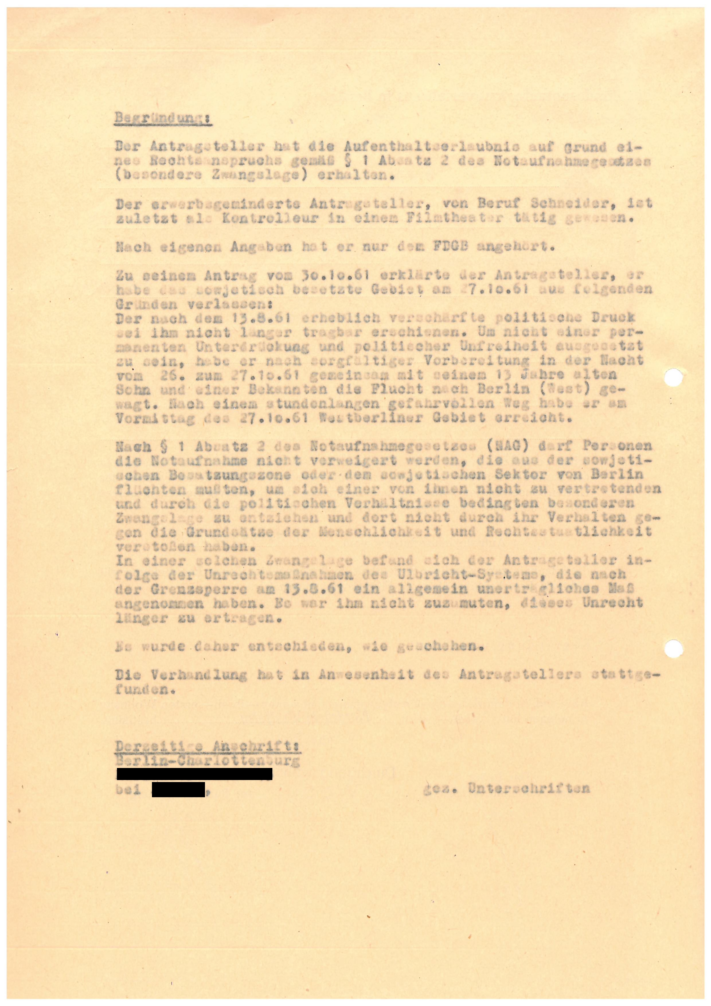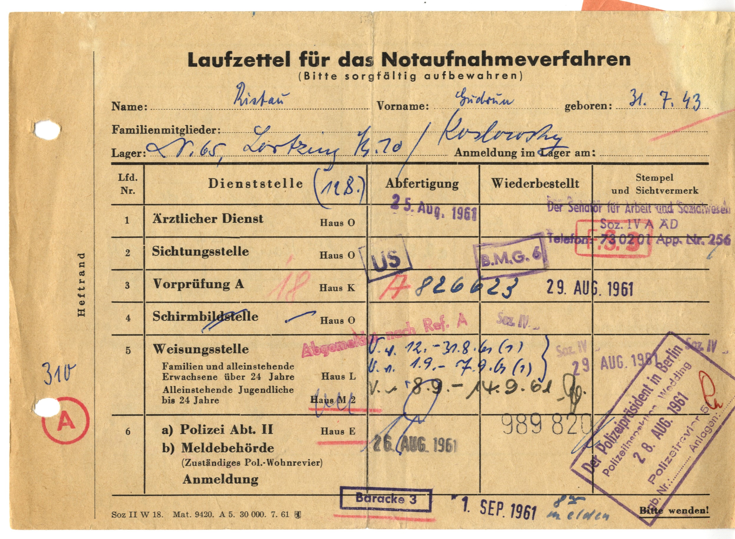 Zwischen 1949 bis 1990 verließen etwa vier Millionen Menschen die DDR in Richtung Bundesrepublik. Das Notaufnahmelager Marienfelde in West-Berlin war für 1,35 Millionen von ihnen die erste Anlaufstelle im Westen. Hier wurden sie untergebracht und durchliefen das Aufnahmeverfahren, um eine Aufenthaltserlaubnis zu erhalten. Zwar konnten Flüchtlinge und Übersiedler aus der DDR auch nach einer Ablehnung in der Bundesrepublik bleiben, Eingliederungshilfen bekamen aber nur Personen, die als politische Flüchtlinge anerkannt waren. Eine der ersten Stationen im Aufnahmeverfahren waren die westalliierten Geheimdienste, die die Ankommenden eingehend befragten. Heute werden hier immer noch Geflüchtete aus aller Welt untergebracht. Auf dem Gelände befindet sich auch die Erinnerungsstätte Notaufnahmelager Marienfelde.