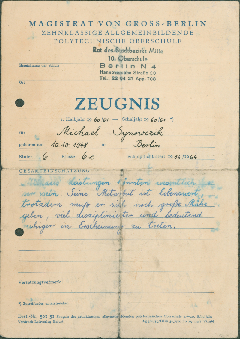 📝 Nur Margit ahnte, was los war, als Micha am Freitag beim morgendlichen Fahnenappell fehlte, bei dem er sich wegen des Streits mit dem Russisch-Lehrer verantworten sollte. Einige Tage später hörte sie von der Lehrerin den lapidaren Satz: “Der Schüler Michael Synowzik kommt nicht mehr in unsere Schule. Sie wohnen nicht mehr hier!” Margit und er schrieben sich in den 1960er Jahren noch Briefe, verloren sich dann jedoch aus den Augen. Margit lebte weiterhin in Ost-Berlin und heiratete später Michas Spielkameraden Burkhard aus dem Vorderhaus. Die beiden wohnen noch heute in Berlin und sind freundschaftlich mit Micha verbunden.